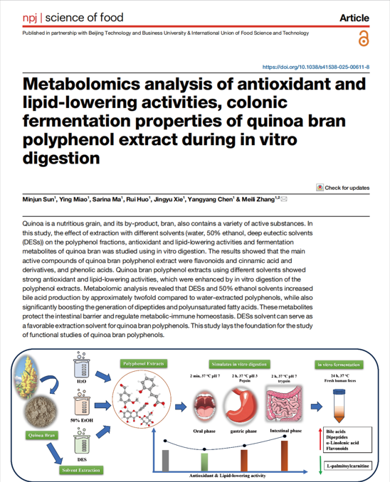 近日,食品科学与工程学院张美莉教授课题组在Nature旗下NPJ系列子刊《npj Science of Food》(中科院一区Top)发表题为“Metabolomics analysis of antioxidant and lipid-lowering activities, colonic fermentation properties of quinoa bran polyphenol extract during in vitro digestion”的研究成果,2022级博士研究生孙敏君为论文第一作者,张美莉教授为通讯作者。该项研究工作得到了国家重点研发计划(2023YFD1600704)的资助。