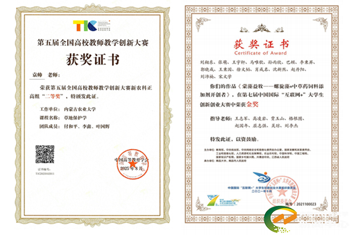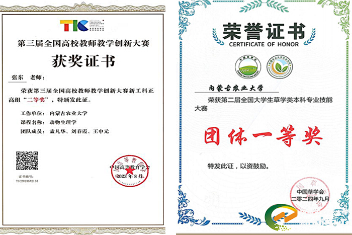 坚持以赛促教、以赛促学。学院教师在全国高校教师各类教学大赛中获国家级二等奖2项、三等奖1项,省部级特等奖2项、一等奖6项、二等奖2项;在中国草学会教育专业委员会承办的“全国草学类本科专业青年教师授课比赛”中获一等奖1项、二等奖2项、三等奖2项。教师教学能力的提升直接带动学生水平的稳步提升。有1名博士生荣获全国草学研究生最高荣誉奖“王栋奖学金”,10名博士硕士研究生获内蒙古自治区优秀学位论文,21名研究生获内蒙古自治区研究生科研创新项目,立项大学生创新创业训练计划项目国家级6项、区级10项,荣获中国国际大学生创新大赛(原互联网+)国赛金奖1项、银奖2项、区奖8项、校奖9项,实现了自治区在国赛上金奖零的突破;荣获首届全国研究生职业规划大赛银奖1项;荣获“挑战杯”全国大学生课外学术科技作品竞赛区奖9项、校奖9项;草业科学本科生连续三年在“全国草学类本科生技能大赛”中摘得桂冠,荣获特等奖1次,一等奖2次。