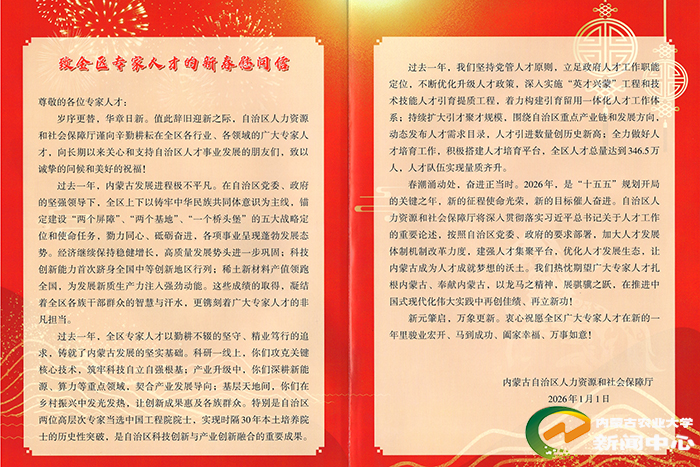 为深入学习贯彻党的二十大及二十届二中、三中、四中全会精神,落实中央和自治区党委人才工作会议部署,营造“尊重劳动、尊重知识、尊重人才、尊重创造”的浓厚氛围,1月21日下午,我校组织开展2026年春节专家人才慰问活动。校党委委员、副校长董同力嘎率人事处负责人,代表自治区人社厅及学校,向专家人才代表致以节日问候与新春祝福,传递深切关怀与崇高敬意,激励专家人才扎根北疆、服务振兴。