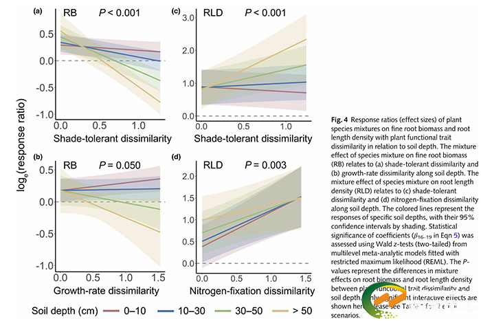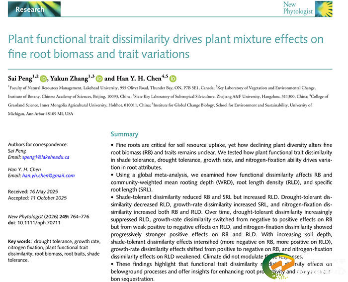 在《New Phytologist》发表的研究,题为“Plant functional trait dissimilarity drives plant mixture effects on fine root biomass and trait variations” ,聚焦于植物多样性对地下根系系统的影响。创新性地从“功能性状差异”的角度,解析了物种混交如何影响细根生物量及关键根系性状(根深、根长密度、比根长)。研究表明,相比于单纯的物种丰富度,植物在耐阴性、耐旱性、生长速率及固氮能力上的功能差异,能更准确地预测混交效应。例如,耐阴性差异显著增加了群落的根长密度;固氮能力的差异显著促进了细根生物量和根长密度的提升,且这种正效应随林龄增加而增强。研究还发现,随着土壤深度的增加,耐阴性差异对根系分布的调控作用愈发显著。该成果强调了在构建混交林或草地群落时,通过合理搭配功能性状差异大的物种,可有效提升地下生产力和生态系统碳固持能。