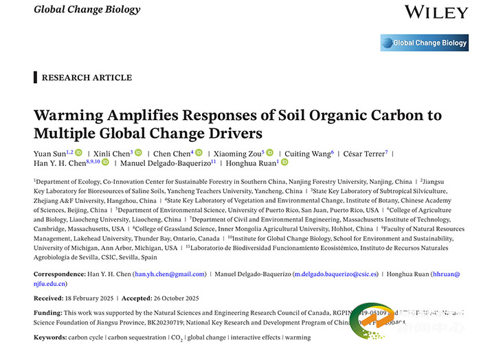 在《Global Change Biology》发表的研究,题为“Warming Amplifies Responses of Soil Organic Carbon to Multiple Global Change Drivers”,系统评估了增温与二氧化碳(CO₂)浓度升高、氮沉降及干旱等因子交互作用对土壤有机碳(SOC)的影响。研究发现,虽然增温单独作用会导致SOC平均降低7.2%,但它在多因子交互中扮演了“催化剂”的角色,显著放大了其他全球变化驱动因子的效应。该研究揭示了增温作为核心调节因子,通过改变养分和水分限制条件,重塑了SOC对气候变化的响应模式,这对理解陆地碳-气候反馈机制具有深远意义。